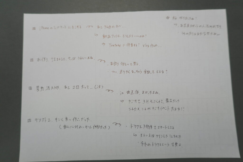 ・喋りたいトピックは手書きのメモを手元に置いて、ペンを持って話す